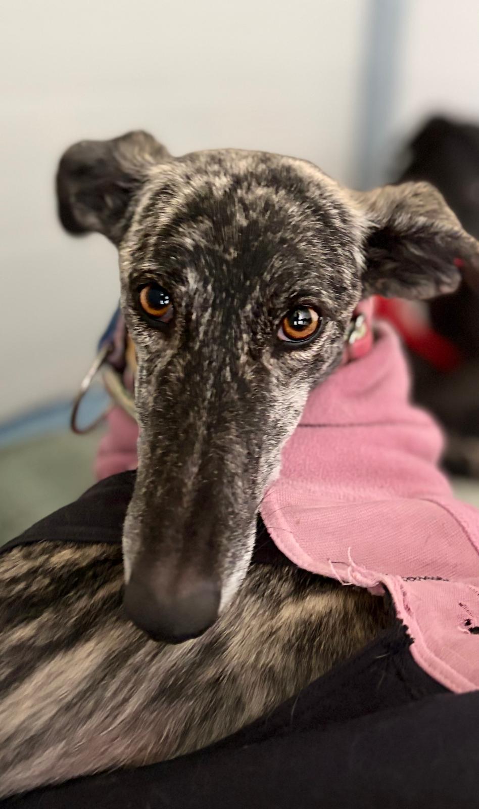 Rocio is a gorgeous small light brindle galga, with sparkling eyes that still carry the shadow of her difficult past. Despite everything she has endured, Rocio is social and gently affectionate — always happy to come up for cuddles. Unlike most two-year-olds, Rocio isn’t bursting with energy or playfulness just yet. Instead, she is quiet, observant, and still learning what it means to feel safe, loved, and free. Having never known affection or kindness, she is slowly discovering the joy of play and the comfort of human touch. Rocio is a quick learner, and her calm, thoughtful nature makes her an incredibly endearing companion. With a little more time and continued love, we’re certain she will blossom — and one day soon, those beautiful eyes will shine with pure joy, no longer haunted by the galguero who discarded her.