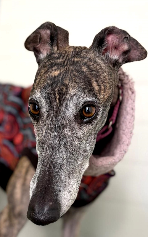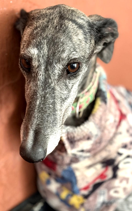 Triana may be 11 years young, but her spirit is pure puppy joy! She’s cheerful, playful, and full of sparkle — a true galga who never got the memo about aging. Whether she’s playing with her doggy friends or bouncing around for your attention, she radiates happiness. With her shiny coat, bright eyes, and bubbly personality, you'd never guess her age — most would assume she’s only two! She’s also much smaller than the average galga and has remained slim, though her appetite is more like a teenager’s. Triana is famously ticklish — give her a proper greyhound-rub and she’ll do a little happy dance just for you. She gets along wonderfully with all dogs, though she might remind everyone who the senior queen is! Triana is a sparkling gem — joyful, affectionate, and ready to light up someone’s life.