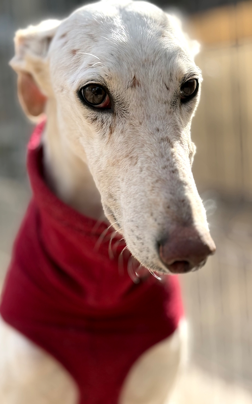 Leo is an absolutely gorgeous and elegant white galgo. His body still bears the marks of a difficult past, but his eyes — so soulful and sad — tell a story not of fear, but of longing for love and connection.Leo is very social and absolutely adores cuddles and affection. At 8 years young, he’s the perfect balance: calm, gentle, and affectionate, yet still active enough to enjoy his days. He is a truly wonderful galgo, just waiting for a loving family to give him the warmth he has always deserved.